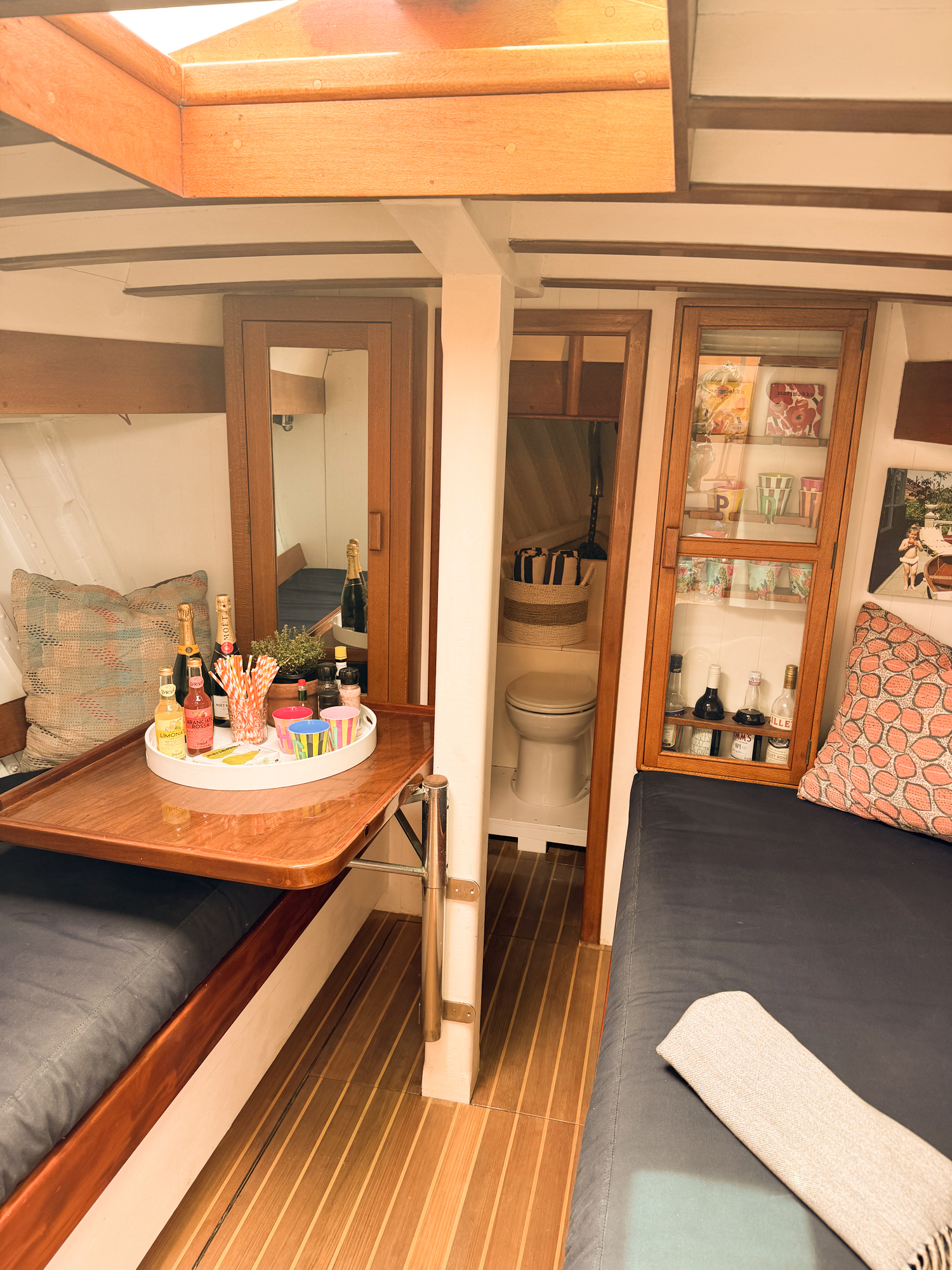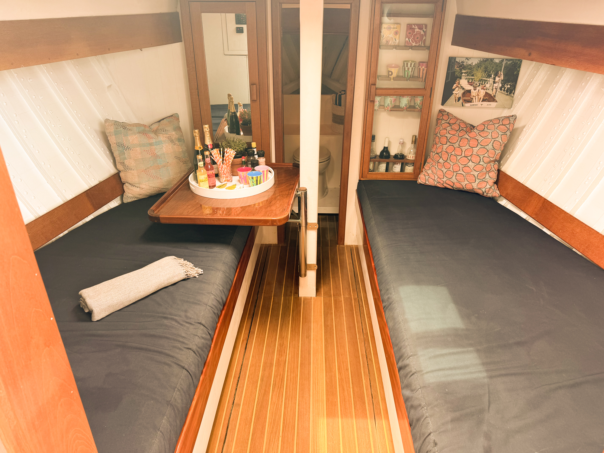 Designed by Alan Payne and built by Mick Nesbitt in approx. 1959 in Balmain, NSW Tropic Star has a very solid double planked hardwood carvel hull with Spotted Gum frames and Oregon deck structure. The layout is set up for comfortable cruising with massive seating areas. The helm is to port and then a doorway leads down to a large enclosed saloon with double beds each side and movable table. At the forward end of the saloon is a doorway to a head area with a sink/electric toilet and cupboard storage. The deck hardware is classic bronze in style and is either original or restored. Most of the under-floor area is accessible which gives access to the engine fuel tanks and water tanks, rudder, steering gear and various electrical and plumbing systems. There is a very large wooden folding table on centreline which has been beautifully built and finished. The flooring panels have all been replaced in 2021 with teak & celery inlay. All weather covers have been replaced by Decca Trimming in 2022.Details